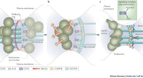 Maintenance of organ homeostasis and control of appropriate responses to environmental alterations requires the coordination of cellular functions and tissue organization. This coordination could be achieved by proteins that can have distinct but linked functions on both sides of the plasma membrane.