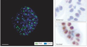 The PML tumour suppressor is necessary for the formation of dynamic nuclear organelles called promyelocytic leukaemia nuclear bodies (PML-NBs). Recent data suggest that different PML-NBs may regulate specific cellular functions according to their protein composition, their position in the nucleus and their mobility.