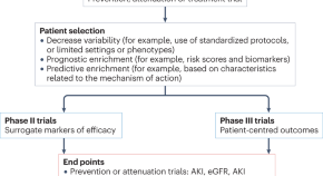 Several factors complicate the identification of effective interventions that can improve the outcomes of patients with acute kidney injury (AKI). Here, the authors discuss key design considerations for clinical trials in hospitalized patients with AKI, including the selection of adequate patient cohorts and study end points.