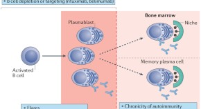 Autoantibodies are produced by plasma cells and contribute to the pathogenesis of many diseases, including systemic or organ-specific autoimmune diseases that involve the kidneys. In contrast to short-lived plasma cells, long-lived plasma cells reside in survival niches in the bone marrow and inflamed tissue, and provide the basis of humoral memory and refractory autoimmune disease activity. Here, the authors discuss the generation of plasma cells, their role in autoimmune disease, and current and future strategies for the depletion of autoreactive plasma cells, including novel approaches that target humoral memory.
