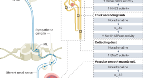 Here, the authors discuss the roles of renal nerves and the effects of renal denervation in hypertension, chronic kidney disease, heart failure and arrhythmias. They suggest that interruption of afferent pathways that modulate sympathetic nervous system activity are likely to underlie some of the beneficial effects of renal denervation.