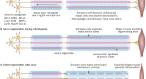 Rodent models of nerve injury are frequently used to study peripheral nerve regeneration, but translating the findings to clinical applications has been difficult, in part because in axons in humans generally need to regenerate over much longer distances, leaving the distal nerves and muscle tissue denervated for long periods of time. In this Review, Scheib and Höke discuss the challenges and advances in the study of peripheral nerve regeneration, and suggest that chronic rodent models of nerve injury more closely mimic the chronic denervation condition that is commonly present in human nerve injuries.