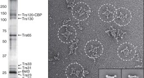 Yeast possesses eight multisubunit vesicle tethering complexes, including TRAPPI and TRAPPII. The TRAPPII complex functions in the late Golgi and consists of all TRAPPI and three specific subunits. Purified native yeast TRAPPII is now characterized by single-particle electron microscopy, providing insights into the molecular basis for human pathologies resulting from defective TRAPP complex function.