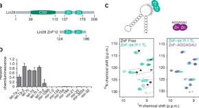Lin28 prevents the processing of pre-let-7 RNAs, but it is not clear where the Lin28 RNA binding domains interact with the RNA. The NMR structure of the Lin28 zinc knuckles with a short RNA motif reveals that each knuckle interacts with an AG dinucleotide, allowing the determination of a consensus motif for pre-let-7 recognition.