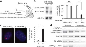 Myotonic dystrophy type 1 (DM1), a multisystem disorder affecting skeletal and smooth muscle and other essential systems, belongs to a group of RNA gain-of-function disorders caused by the expansion of a CUG trinucleotide repeat (CUGexp) in the 3' untranslated region of the DM protein kinase (DMPK) gene. Furling and coworkers have developed an optimized human U7-snRNA containing a poly-CAG antisense sequence to target the CUGexp RNAs. These constructs cause specific degradation of pathogenic but not wild-type DMPK RNA products. By abolishing the RNA gain-of-function toxicity responsible for pathogenesis, these hU7-snRNAs could affect gene silencing in other RNA-dominant disorders expressing expanded repeats.