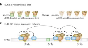 Exon junction complexes (EJCs) are deposited on mRNAs during splicing and are key regulators of the post-transcriptional fate of messenger ribonucleoprotein particles (mRNPs). Two recent papers reporting on the transcriptome-wide mapping of EJC-binding sites in human cells reveal an unexpected heterogeneity of EJC distribution on mRNAs and a tight network of EJC–SR protein interactions contributing to the formation of a higher-order, compacted mRNP structure.