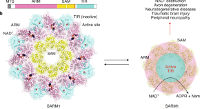 The protein SARM1 is an executioner of axon degeneration through its NAD+ hydrolase activity. Three groups now report structures of human SARM1 in an inactive state and identify NAD+ as an allosteric inhibitor, illuminating an elegant mechanism of how SARM1 is activated at lower NAD+ levels and causes NAD+ collapse and axon degeneration.