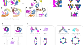 ABC-type heterotrimeric proteins can be designed de novo using coiled coils and helical bundles as starting scaffolds, extended using helical repeat proteins and then used as building blocks for higher-order oligomeric assemblies.