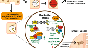 Low-molecular-weight cyclin E (LMW-E) overexpression promotes genomic instability in human mammary epithelial cells and associates with genomic instability in early-stage breast tumors. Full-length cyclin E (FL-cycE) overexpression leads to accumulation of replication stress, DNA damage, and ultimately cell death. Mechanistically, LMW-E upregulates the expression of CDC6, RAD51, and C17orf53. LMW-E, but not FL-cycE, facilitates replication stress tolerance by promoting pre-replication complex assembly in a CDC6 dependent manner and DNA damage repair in a RAD51- and C17orf53-dependent manner. Targeting the ATR-CHK1-RAD51 pathway with small molecule inhibitors significantly decreased LMW-E–overexpressing cell viability. In breast tumor samples, positive LMW-E status independently predicts genomic instability and tumor recurrence.