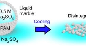 Thermo-responsive liquid marbles can be prepared using poly(N-isopropylacrylamide) powder and Na2SO4 aqueous solution, which were transferred to the surface of bulk water containing Na2SO4 aqueous solution. They remained stable at room temperature. When the bulk aqueous solution was cooled, the liquid marbles disintegrated because powder wettability increased. Thus, the remote triggering of chemical reactions using liquid marbles can be achieved by cooling.