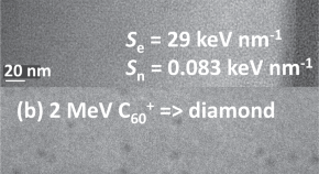 While high-energy heavy ions create cylindrical damage zones called ion tracks in many materials, diamond was an exception for a long time. The authors have succeeded in creating the ion tracks in diamond utilizing 2−9MeV C60 fullerene ion irradiation and studied the structure of the tracks.