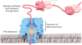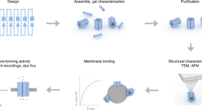 Artificial systems to control the transport of molecules across biomembranes can be useful for biosensing or drug delivery. Here, the authors assemble a DNA channel enabling the precisely timed, stimulus-controlled transport of functional proteins across bilayer membranes.