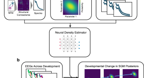 A major goal of computational neuroscience is to produce models with few parameters which can account for significant aspects of behavioral, neural or physiological data. The authors perform simulation-based inference on EEG spectral features with the Spectral Graph Model, and demonstrate that spectral maturation of the brain activity is an emergent phenomenon guided by age-dependent tuning of localized neuronal dynamics.