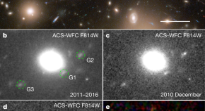 • A massive star at a redshift of 6.2, corresponding to 900 million years after the Big Bang, is magnified greatly by lensing of the foreground galaxy cluster WH0137–08.