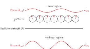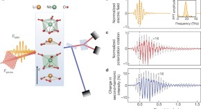 • Ultrafast pulses of terahertz radiation are used to excite individual vibrational modes in a magnetoresistive manganite. In a system such as this, with strongly correlated electrons, even subtle changes of crystal structure can have a profound effect on material properties, and this is indeed what they see: the activated vibration is sufficient to drive the material from a stable insulating phase to a metastable metallic one.