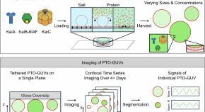 • The remarkable fidelity of the cyanobacterial clock is poorly understood. Here, the authors reconstitute the clock in cell-like vesicles and reveal that high protein concentrations, associated regulators, and transcription translation feedback buffer stochastic variation in protein levels to maintain high fidelity and phase synchrony.