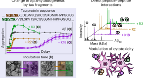 • The interplay between tau and amyloid-β (Aβ) in the development of Alzheimer’s disease is not fully understood. It has now been shown that tau’s microtubule-binding repeat regions, which contain a combination of hydrophobic and hydrophilic sections, interact with Aβ to form hetero-assemblies, which can modify Aβ amyloidogenesis and alleviate Aβ-induced cytotoxicity.