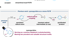 • The streamlined dual-functional group transfer strategy represents an efficient and sustainable approach for difunctionalization reactions, where all atoms or functional groups from the starting materials are fully incorporated into the final products. Herein, the authors report a regioselective pyridylcyanation of internal alkynes enabled by an oxalate-based photocatalytic system, employing cyanopyridine as a streamlined dual-functional group transfer reagent.