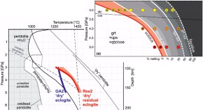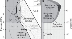 What defines the boundary between the Earth's lithosphere and asthenosphere? Here it is shown experimentally that the instability of the hydrous mineral pargasite at depths greater than about 90 km causes a sharp drop in the water-storage capacity of a fertile upper-mantle mineralogy, and accordingly a sharp drop in its solidus temperate. This effect might define the lithosphere–asthenosphere boundary.