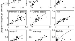 Group formation by both predators and prey dramatically reduces predator search efficiency. Field data on lions and their large herbivore prey from Serengeti National Park suggest that group formation by both predators and prey has an enormous impact on Serengeti population dynamics, lending a stabilizing influence to what would be otherwise be a highly unstable situation.