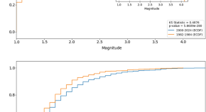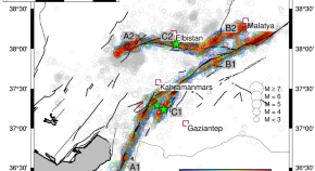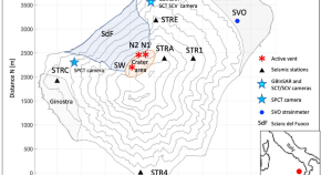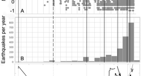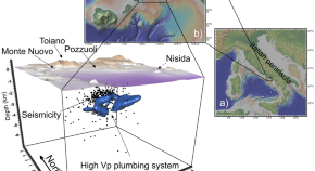 The caldera of Campi Flegrei volcano shows space-dependent rheological behaviour due to the interplay between overpressure sources and geological structures, according to 3D tomography of b-values and correlation with subsurface structures.
