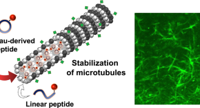Microtubules (MTs) consisting of tubulins are important targets of drugs for MT-related diseases. We have previously designed a linear Tau-derived peptide (TP) that binds to the interior of MTs. In this article, a cyclic TP (TCP) was developed for enhanced binding to tubulin and stabilization of MTs. The fluorescently labeled TCP exhibited a remarkably enhanced binding affinity to tubulin compared to the linear TP. The stabilization of MTs by binding of TCP was demonstrated, such as formation of typically unstable MTs in the presence of guanosine triphosphate.