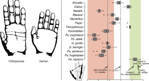 The human hand can be distinguished from that of apes by its long thumb relative to fingers. Here the authors show that hand proportions vary greatly among ape species and that the human hand evolved from an ancestor that was more similar to humans than to chimpanzees.
