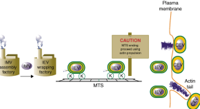 Commuters can ride a high-speed mass-transit system from the city centre to the suburbs and then engage a private vehicle for the final leg home. Similarly, vaccinia virions travel to the cell periphery on microtubule tracks, disembark near the plasma membrane, and acquire individual actin tails for propulsion on microvilli towards adjacent cells.