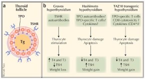 Autoantibodies to thyroid peroxidase are the hallmark of Hashimoto thyroiditis, the most common form of thyroid autoimmunity. However, the relative contribution of antibodies and T cells to disease has been a long-standing controversy—now settled by a transgenic mouse model. Thyroid peroxidase–specific T cells, in the absence of mature B cells and antibodies, spontaneously infiltrate and destroy the thyroid gland, causing overt hypothyroidism and obesity (pages 920–926).