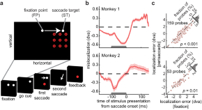 Saccadic eye movements cause substantial shifts in the retinal image as we take in visual scenes, but our perception is stable and continuous; here, visual receptive fields are shown to shift dramatically towards the saccadic goal, running counter to the long-standing hypothesis of receptive field remapping as the basis of perceived stability.