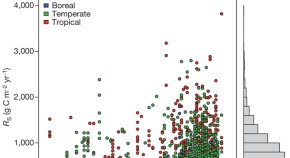 Soil respiration (RS) is the flux of microbial- and plant-respired carbon dioxide from the soil surface to the atmosphere, and constitutes the second-largest terrestrial carbon flux. It has been suggested that RS should change with climate, but this has been difficult to confirm observationally. It is shown here, however, that the air temperature anomaly (the deviation from the 1961–1990 mean) correlates significantly and positively with changes in RS.