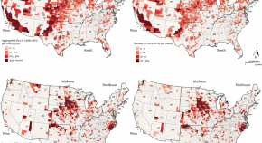 • Approximately 25 percent of animal feeding operations in the US are located in thirty counties, and the location of these operations is associated with heightened concentrations of fine particulate matter, according to an analysis that utilizes data on animal operations and emissions.