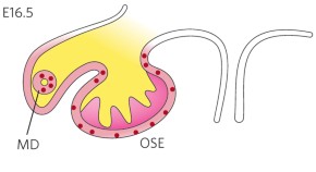 Lgr5, a marker of stem cells in many organs, is found expressed in cells scattered through the ovarian epithelium that expand to repair and regenerate the damaged ovarian surface after each ovulation. Lgr5-positive stem cells in the ovary and the fimbria of the oviduct may be critical cells of origin for ovarian cancer.