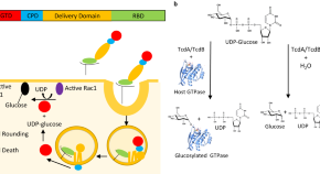 The Clostridium difficile virulence factors TcdA and TcdB contain a glucosyltransferase domain (GTD), which has both glucohydrolase (GH) and glucosyltransferase (GT) activities. Here, the authors characterize the transition state features of the TcdA and TcdB GH reactions by measuring kinetic isotope effects and they identify two transition state analogues, isofagomine and noeuromycin that inhibit TcdA and TcdB. They also present the crystal structures of TcdB-GTD bound to these inhibitors and the reaction product UDP.