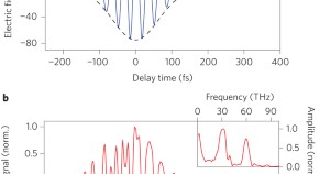 • Terahertz waveforms with peak fields of 72 MV cm−1 and a central frequency of 30 THz drive interband polarization in bulk GaSe off-resonantly and accelerate excited electron–hole pairs, inducing dynamical Bloch oscillations. This results in the emission of phase-stable, high-harmonic transients over the whole frequency range of 0.1–675 THz.