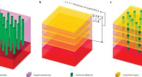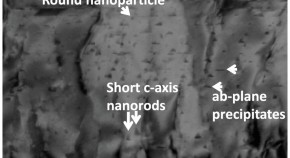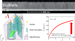 High critical current density and strong pinning efficiency for Fe-based superconductor, K-doped BaFe2As2, were achieved by naturally formed low-angle grain boundary networks. K-doped BaFe2As2 thin film is composed of columnar grains with widths of approximately 30–60 nm. The grains are rotated around the b- (or a-) axis by 1.5° and around the c-axis by −1°, resulting in the formation of low-angle grain boundary networks. The achieving superconducting properties are almost 10 times as high as the K-doped BaFe2As2 single crystal and comparable to ion-irradiated single crystal.
