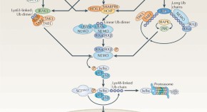 The ubiquitin conjugation system regulates the canonical NF-κB activation pathway, which mediates immune responses. Linear polyubiquitin chains—in which the C terminal glycine of ubiquitin is conjugated to the α-amino group of the amino-terminal methionine of another ubiquitin—are generated by a unique ubiquitin ligase complex called linear ubiquitin chain assembly complex (LUBAC) composed of two RING domain proteins called HOIL-1 and HOIP. This is one of three complementary studies identifying a novel component of the LUBAC complex called SHARPIN, which is recruited to receptor signalling complexes (RSCs) that form after TNF and CD40L stimulation. The LUBAC complex containing SHARPIN stimulates the formation of linear ubiquitin chains in vitro and in vivo and is required for the activation of NF-κB signalling.