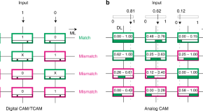 Designing low power and high performance content-addressable memory remains a challenge. Here, the authors demonstrate a content-addressable memory concept and circuit which leverages the analog conductance tunability of memristors, reduces power consumption, and enables new functionalities and applications.