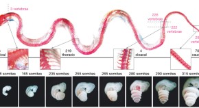 The vertebrate body axis is divided into a number of segments or 'somites', such as the number of vertebrae. But what controls vertebra number, and its variation between species? This paper postulates that the number depends on a balance between the division of the body into somites (the segmentation clock rate) and the overall rate of development, as established by showing that the large number of vertebrae in snakes comes from a much greater segmentation clock speed in snakes, relative to development as a whole, than in other vertebrates.