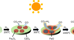 A series of FeO-CeO2 nanocomposite catalysts (FeCe-x) were successfully fabricated by hydrogen reduction of hydroxide precursors at temperatures (x) between 200–600 °C. A FeCe-300 catalyst with a Fe:Ce ratio of 2-1 exhibited excellent performance for photothermal CO2 hydrogenation to CO (CO selectivity = 99.87%, CO production rate 19.61 mmol h−1 gcat−1, excellent stability). The FeO phase was effective in promoting the reverse water-gas shift (RWGS, CO2 + H2 → CO + H2O). Catalysts prepared at higher reduction temperatures contained both Fe0 and FeO, with the Fe0 catalyzing the Sabatier reaction (CO2 + 4H2 → CH4 + 2H2O) and thus lowering FeCe-x catalyst selectivity to CO.