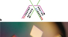 Although we live in a macroscopic three-dimensional (3D) world, our best description of the structure of matter is at the atomic and molecular scale. Reconciling these two scales with atomic precision requires high spatial control of the 3D structure of matter, with the simplest practical route to achieving this being to form a crystalline arrangement by self-assembly. Here, the crystal structure of a designed, self-assembled 3D crystal based on the DNA tensegrity triangle is reported.