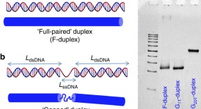DNA can be used as a tunable building block to create a variety of self-assembly-driven liquid crystals. Here, the authors report the stabilization of a smectic-A liquid crystal phase, where constituent molecules—two rigid dsDNA segments linked by a flexible ssDNA spacer—attain a folded configuration.