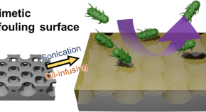 A microstructured film was fabricated using the breath figure method, and a slippery surface was achieved by infusing silicone oil onto the film. Among the obtained samples, oil-supported pincushion films (oPCF) most efficiently prevented water droplets and microorganisms from adhering to the surfaces. In addition, the adhesion of E. coli and B. subtilis to oPCF was reduced to 7.1 and 13% of that pertaining to PTFE, respectively. These results suggest that our efficient antifouling substrate can ensure human health and environmental safety without the use of any toxic compounds.