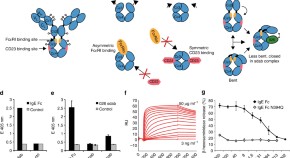 IgE is linked to allergic diseases and there is a great interest in developing anti-IgE therapeutics. Here the authors characterize the binding of human IgE Fc to a single domain antibody (sdab) and show that the sdab induces a closed conformation, which prevents and disrupts IgE binding to its receptor FcεRI and abrogates allergen mediated activation.