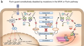 The Pyrin inflammasome guard is disabled if the activity of small cellular GTPase is compromised in response to defects in the mevalonate pathway and is disabled directly by mutations in the gene encoding Pyrin, which results in the interleukin 1β (IL-1β)-driven autoinflammatory diseases MKD and FMF.