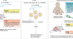 • 12,13-diHOME produced by the gut microbiome promotes an asthma-like immunophenotype in the lungs of a murine experimental model. Accordingly, the metabolite is elevated in neonates who developed asthma during childhood, potentially providing a biomarker for early risk prediction and a novel therapeutic target.