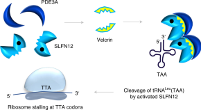 The small molecule DNMDP acts as a velcrin by inducing complex formation between phosphodiesterase PDE3A and SLFN12, which kills cancer cells that express sufficient levels of both proteins. Here, the authors present the cryo-EM structure of the DNMDP-stabilized PDE3A-SLFN12 complex and show that SLFN12 is an RNase. PDE3A binding increases SLFN12 RNase activity, and SLFN12 RNase activity is required for DNMDP-mediated cancer cell killing.