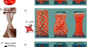 In this work, authors show auxetic cylindrical shells (meta-shells) with periodicities along helical paths that trigger radial contraction when twisted. The contraction coincides with a softening followed by a stiffening that ultimately circumvent the torsional buckling under large torsional deformation.