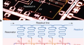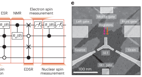 • A four-qubit processor of three phosphorus nuclear spins and an electron spin in silicon enables the implementation of a three-qubit Grover’s search algorithm with 95% fidelity. The implementation is based on an advanced multi-qubit gate with single-qubit gate fidelities above 99.9% and two-qubit gate fidelities above 99%.