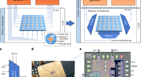 • Singlet–triplet qubits implemented in a 2 × 4 germanium quantum dot array allow for a quantum circuit that generates and distributes entanglement across the array with a remote Bell state fidelity of 75(2)% between the first and last qubit.